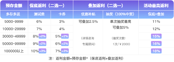 活動期間預(yù)存金額滿¥5000,即可享受多重返利,最高可達(dá)18%。(預(yù)存費(fèi)用需在7月15日前到賬,若未到賬則視為自動放棄本次活動)