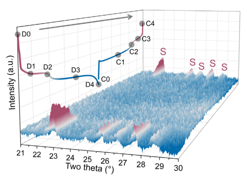 作者對水系硫電極進(jìn)行了原位XRD測試,發(fā)現(xiàn)硫電極在放電時峰逐漸消失,在充電時峰重新出現(xiàn),這證明硫電極發(fā)生了轉(zhuǎn)化反應(yīng),同時電極也具有高度可逆性。