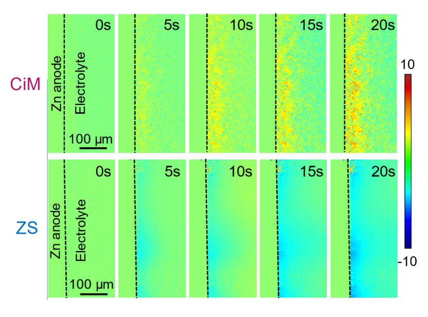作者對鋅金屬負(fù)極進(jìn)行了界面修飾,通過原位監(jiān)測界面處的離子濃度分布,證實(shí)了特定修飾可以促進(jìn)鋅離子擴(kuò)散,從而避免鋅枝晶形成。